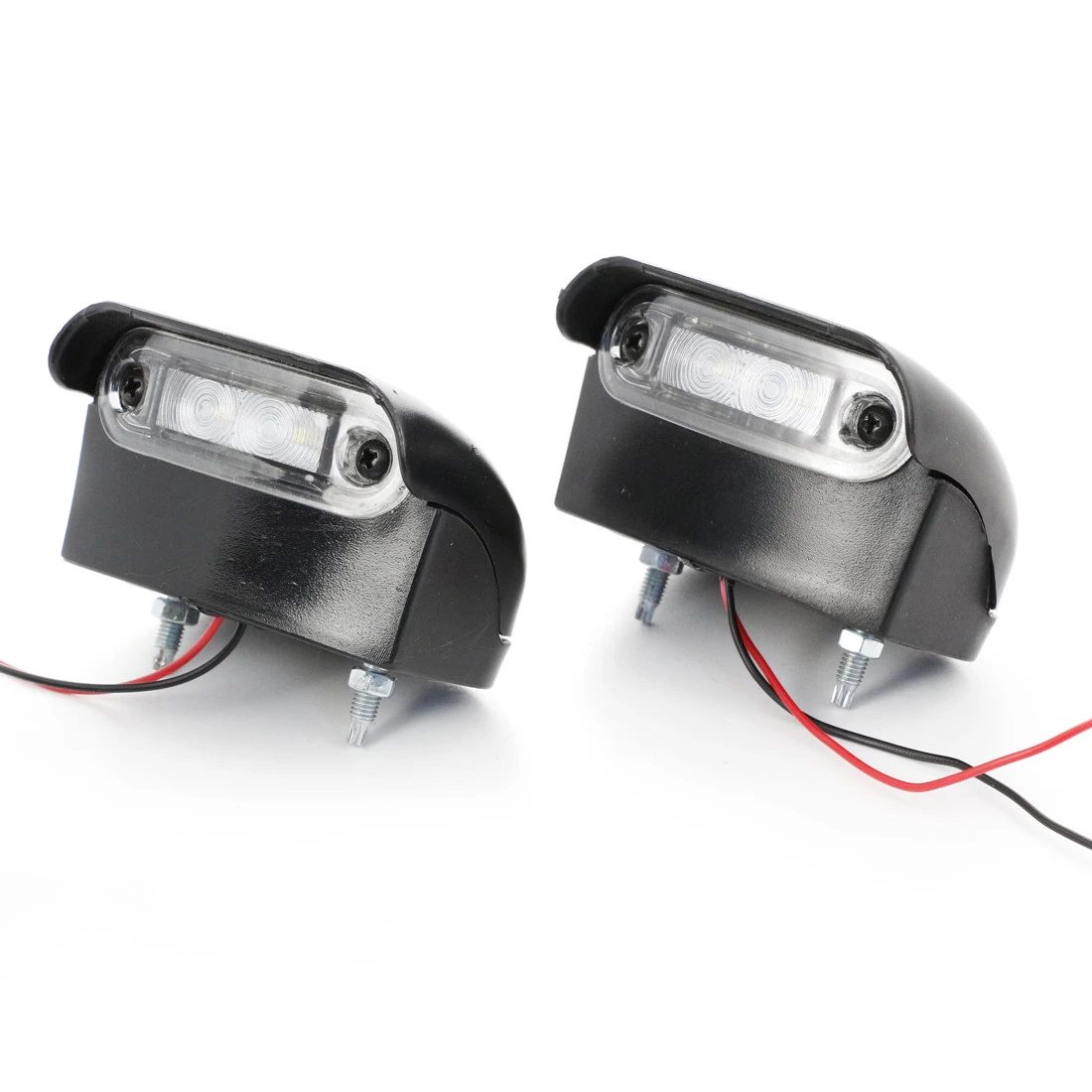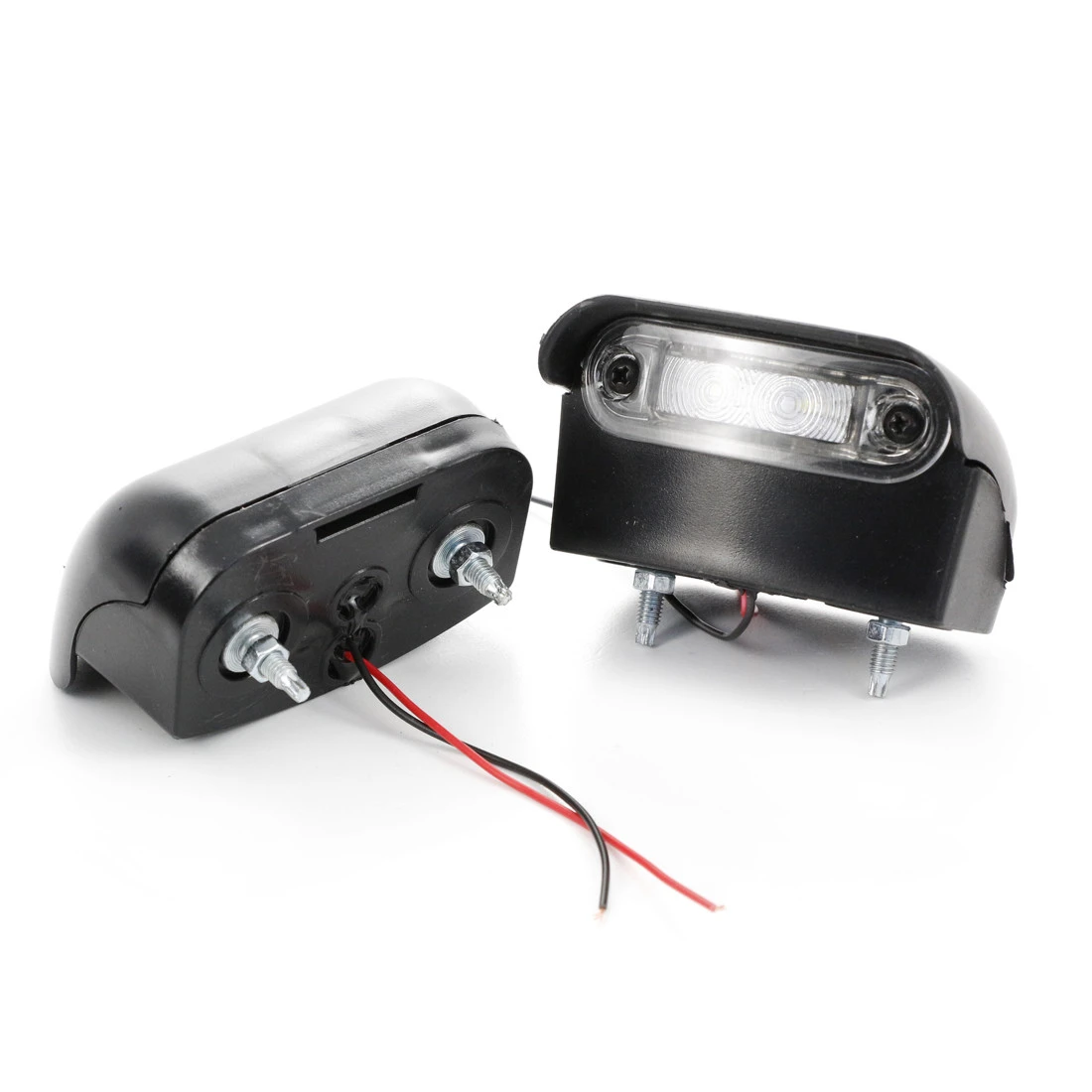 | 2x Number Plate LED Lights Rear/Front Number Plate Lamps Body color: #000000; for every vehicle with 24 Volts electrical system Unit size: 80x70x50 mm Distance between fitting bolts: 48 mm Cable length: 100 mm Wiring instruction: black cable – minus (-), red cable plus (+) Material: ABS plastic, shockproof, waterproof